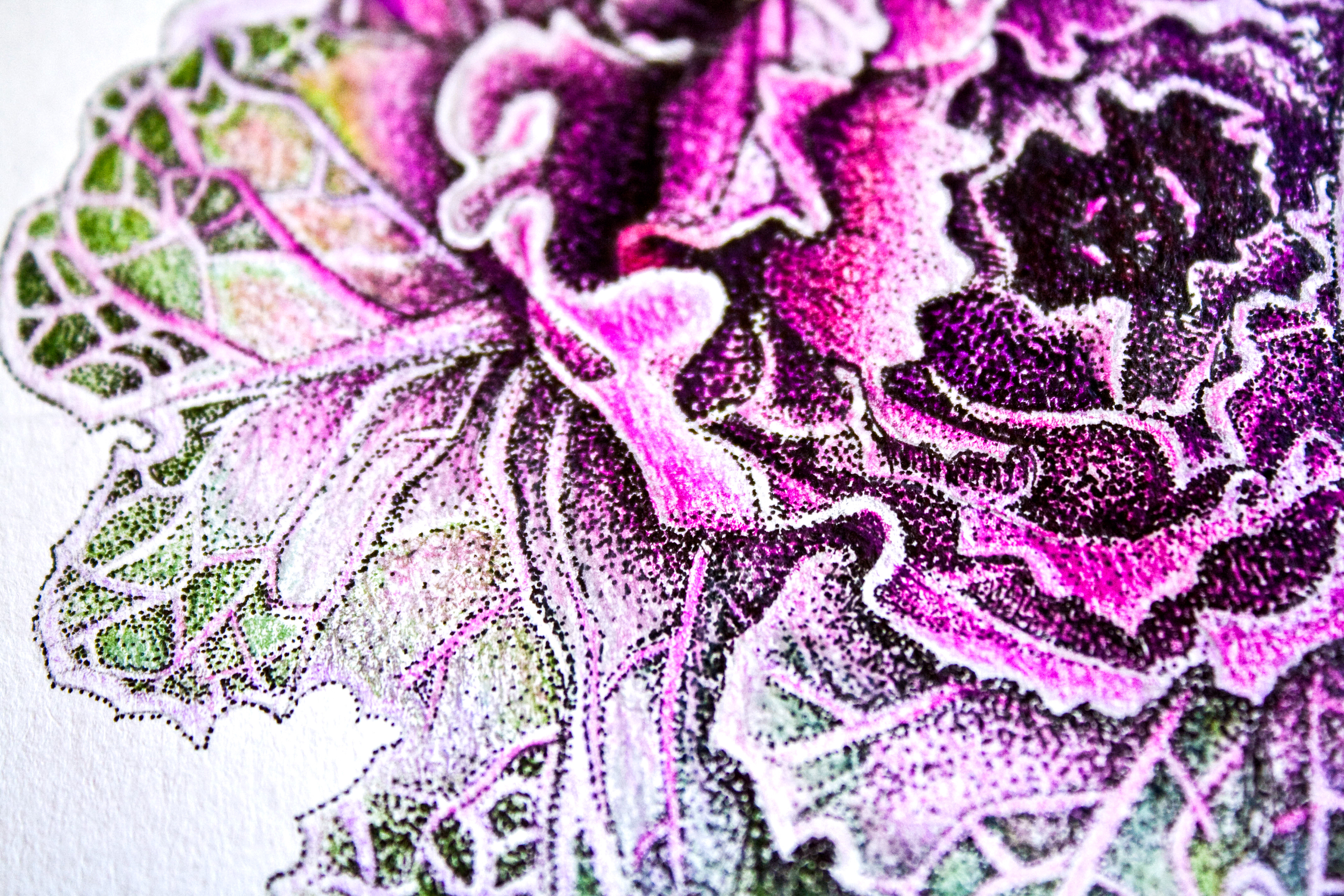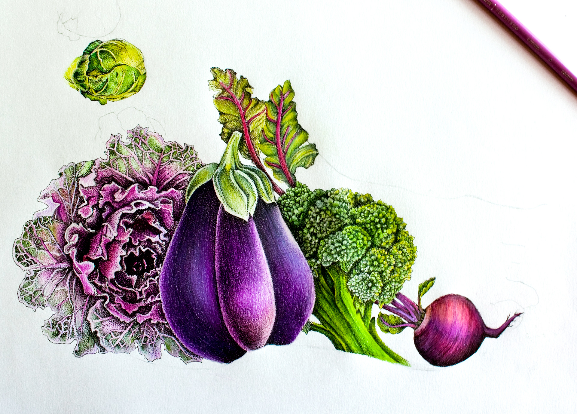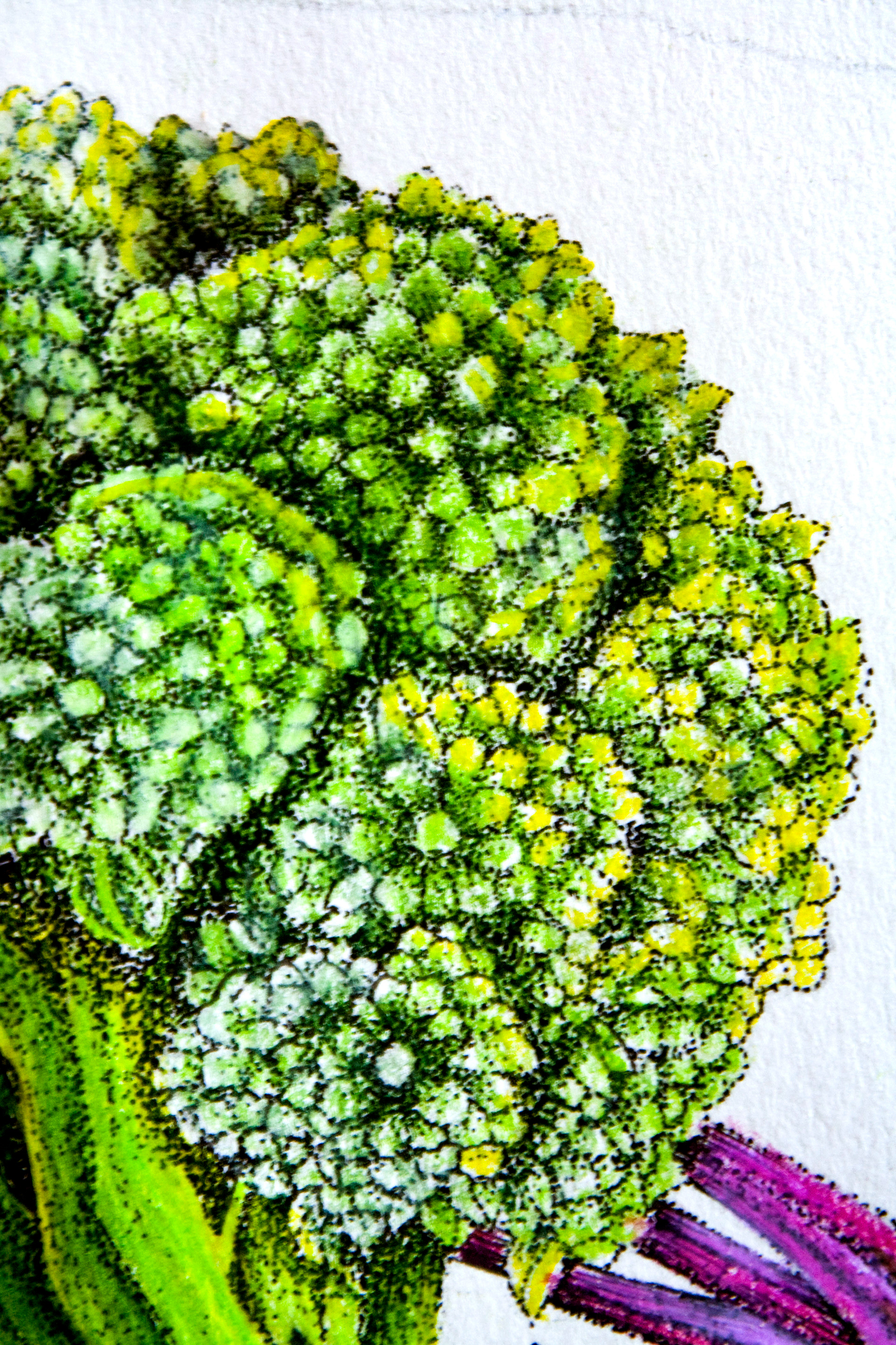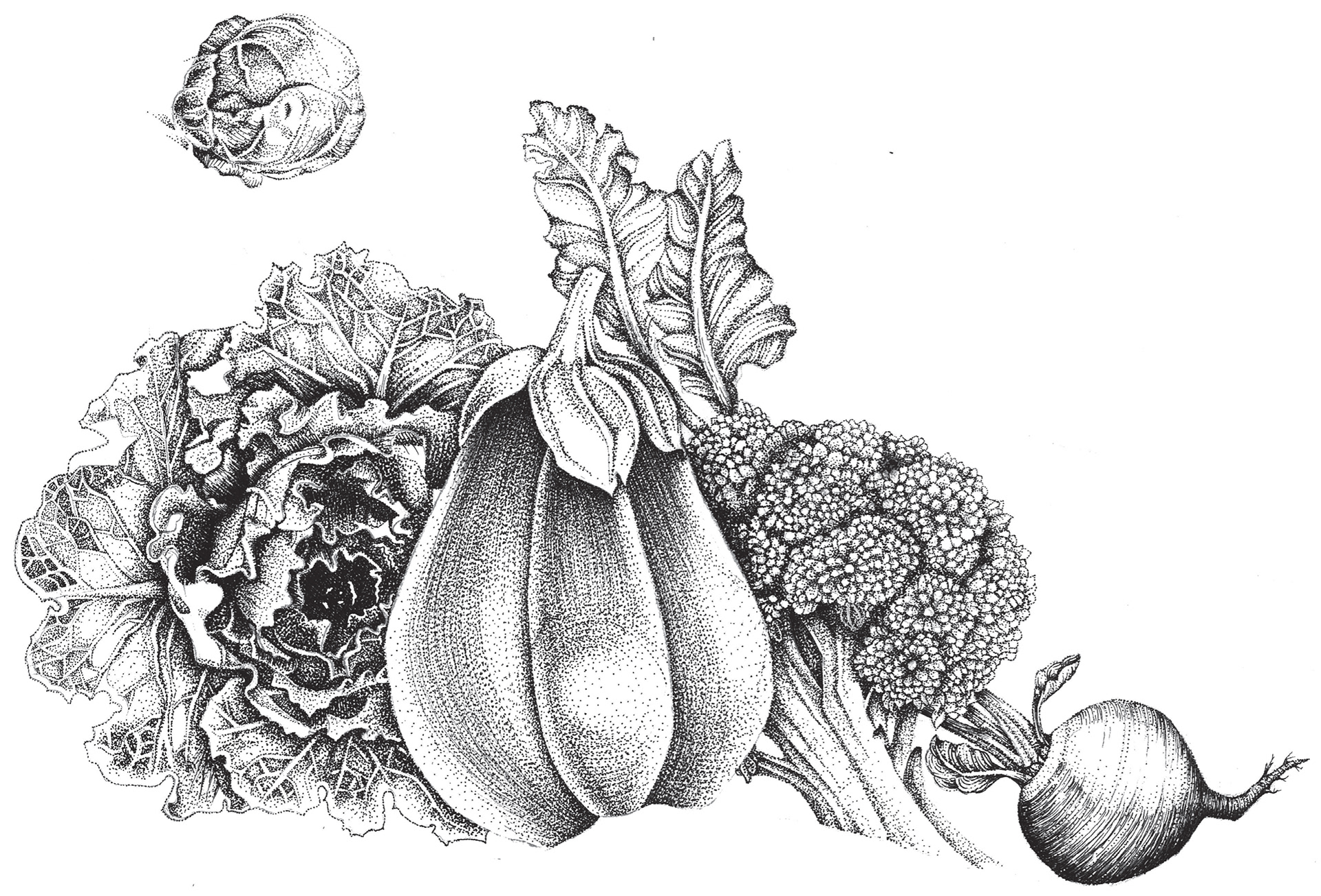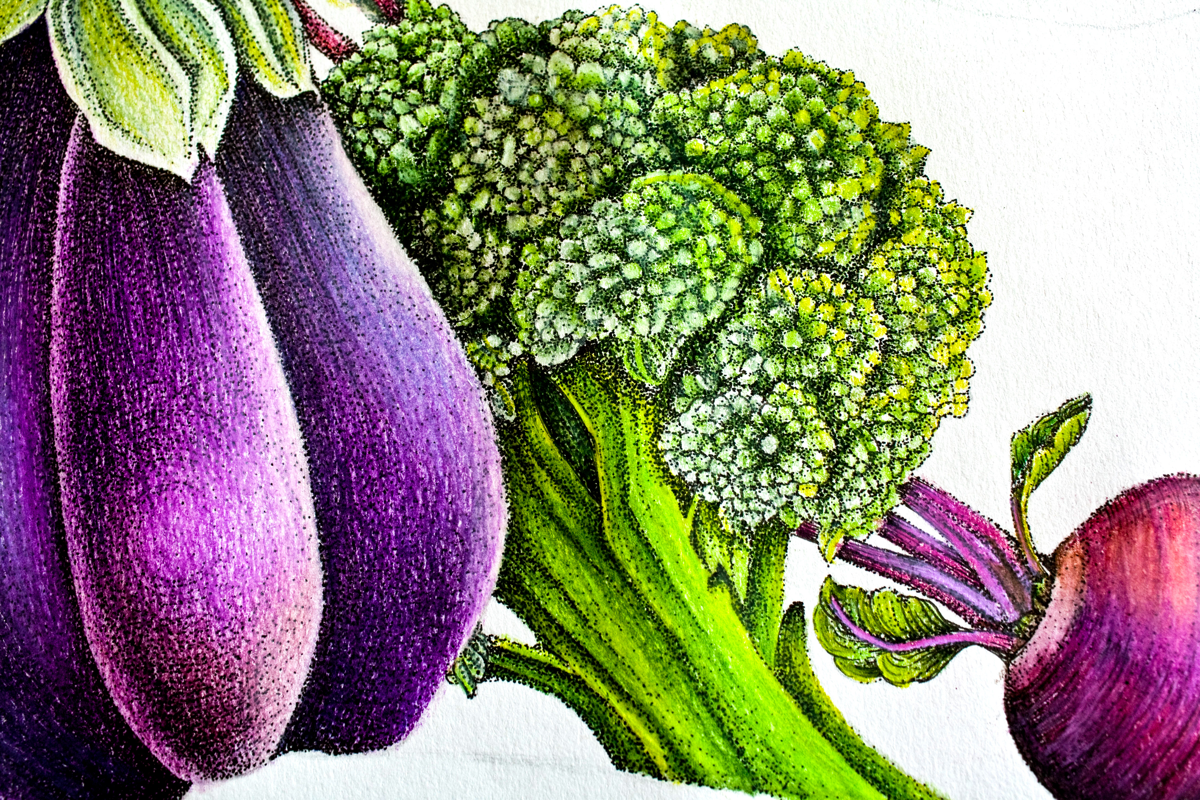 Commissioned vegetables. Drawn in pencil, stippled in pen and filled with colored pencils.
